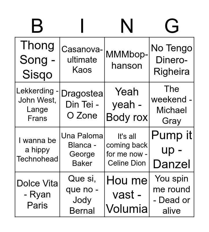 This bingo card has 45 words: Free!, Dolce Vita - Ryan Paris, Where do you go- No mercy, Everywhere- Fleetwood Mac, Be my lover- la Bouche, Vamos a la Playa- Righeira, MMMbop- hanson, Butterfly - Crazy town, Lekkerding - John West, Lange Frans, Leef- André Hazes Jr., No Tengo Dinero- Righeira, Que si, que no - Jody Bernal, Bloed, zweet en tranen - Andre Hazes, Banger hart - Rob de Nijs, Ik heb de hele nacht liggen dromen - Wolter Kroes, Narcotic- Liquido, The rhythm of the Night - Corona, It's all coming back for me now - Celine Dion, Just say Hello - Rene Froger, Una Paloma Blanca - George Baker, Casanova- ultimate Kaos, Don;t stop believing- Journey, Met z'n allen - The cooldown cafe, Thong Song - Sisqo, I want it that way - Backstreet boys, Hou me vast - Volumia, L'amour toujours - Gigi D'agostino, Captain Jack, The world's Greatest - R. kelly, You spin me round - Dead or alive, Better off Alone - Alice DJ, Ding Dong Song - Gunther & the sunshine, Sandstorm - Darude, Somebody dance with me DJ Bobo, No Limit - 2 unlimited, Pump it up - Danzel, King of my castle - Wamdue Project, Push the feeling on - Nightcrawlers, Saturday Night - Whigfield, The weekend - Michael Gray, Dragostea Din Tei - O Zone, I wanna be a hippy Technohead, We're going to Ibiza - Vengaboys, Yeah yeah - Body rox and Infinity - Guru.
