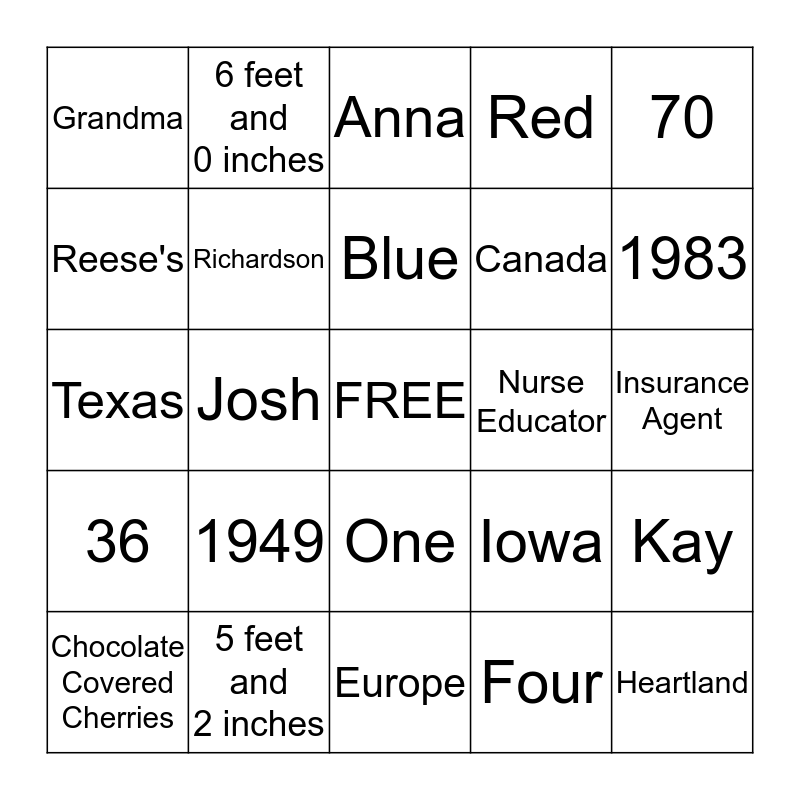 This bingo card has 25 words: 1949, Europe, Blue, Chocolate Covered Cherries, 70, Grandma, Reese's, 6 feet and 0 inches, Nurse Educator, One, Canada, Texas, Iowa, Kay, Richardson, Heartland, Insurance Agent, Anna, 1983, Josh, FREE, 5 feet and 2 inches, 36, Red and Four.