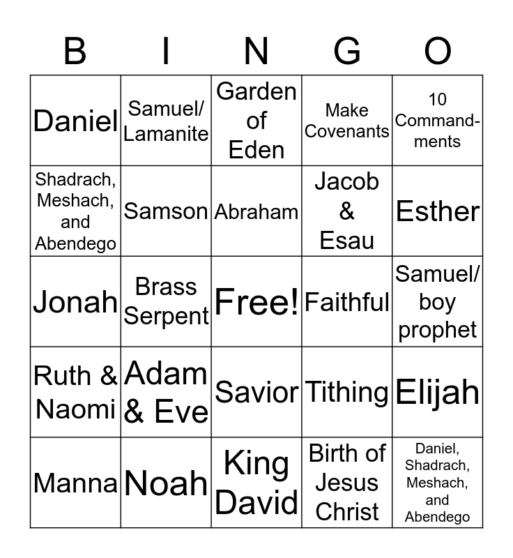 This bingo card has a free space and 24 words: Adam & Eve, Noah, Abraham, Manna, 10 Command-ments, Daniel, Shadrach, Meshach, and Abendego, Samuel/ Lamanite, Faithful, Savior, Jacob & Esau, Jonah, Tithing, Elijah, Samson, Birth of Jesus Christ, Samuel/ boy prophet, Garden of Eden, Esther, Brass Serpent, Daniel, Shadrach, Meshach, and Abendego, Ruth & Naomi, Make Covenants and King David.