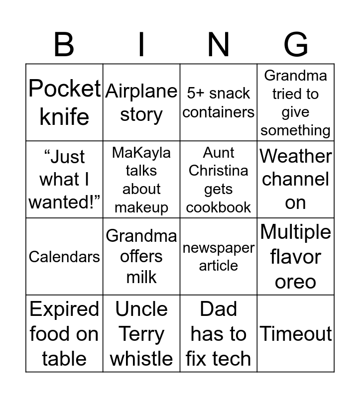 This bingo card has 16 words: Uncle Terry whistle, Multiple flavor oreo, 5+ snack containers, Pocket knife, Calendars, Airplane story, newspaper article, Dad has to fix tech, “Just what I wanted!”, MaKayla talks about makeup, Expired food on table, Grandma tried to give something, Grandma offers milk, Weather channel on, Aunt Christina gets cookbook and Timeout.