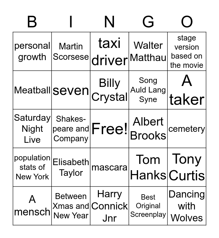 This bingo card has a free space and 46 words: Molly Ringwald, Dancing with Wolves, Journalist, Harry Connick Jnr, Elisabeth Taylor, Burt Lancaster, Martin Scorsese, four, Meatball, Mr Roberts, seven, Walter Matthau, Tony Curtis, Tom Hanks, Rom Com, Crazy Rich Asians, Billy Crystal, Albert Brooks, Can a man and a women be friends, stage version based on the movie, Shakes- peare and Company, Best Original Screenplay, personal growth, Song Auld Lang Syne, herself, A taker, A mensch, A cracked mirror, mascara, population stats of New York, adultery and infidelity, Neil Simon, Katz's Deli, Calvin Clifford, sister and brother in-law, Between Xmas and New Year, cemetery, west sixties, Hays Code, Brief Encounter, Music Man, taxi driver, Saturday Night Live, Jealous Lover, 1976 toyota Corona Wagon and ones that say Sunday.