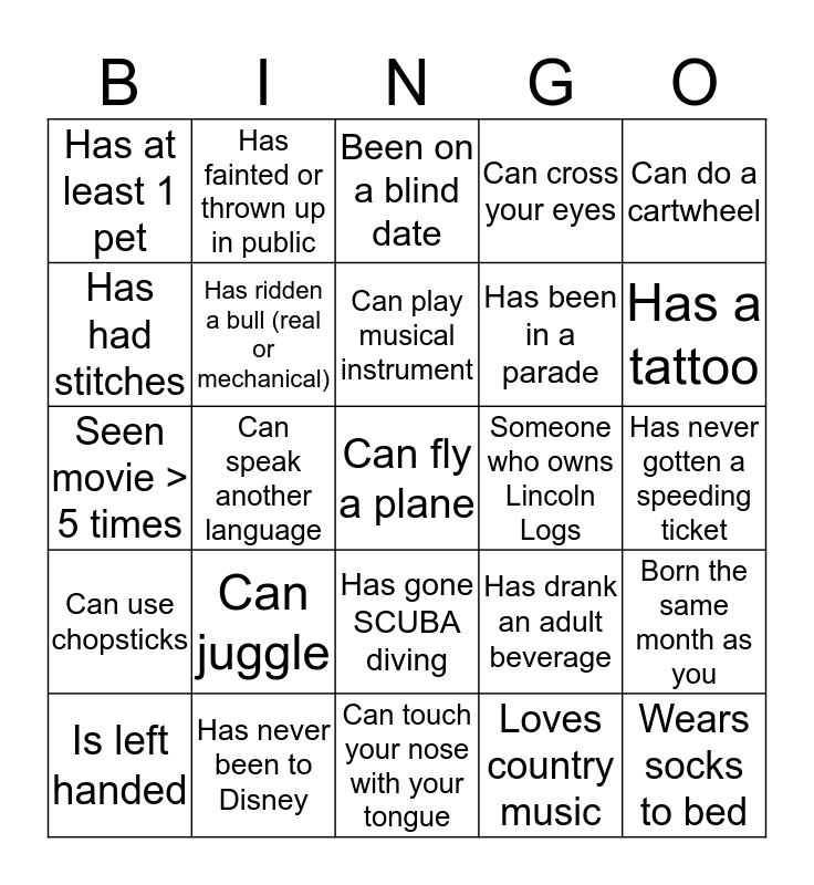 This bingo card has 25 words: Can juggle, Can touch your nose with your tongue, Can play musical instrument, Is left handed, Can do a cartwheel, Has at least 1 pet, Has had stitches, Has fainted or thrown up in public, Someone who owns Lincoln Logs, Has gone SCUBA diving, Has been in a parade, Seen movie > 5 times, Has drank an adult beverage, Born the same month as you, Has ridden a bull (real or mechanical), Wears socks to bed, Has never gotten a speeding ticket, Been on a blind date, Has a tattoo, Can speak another language, Can fly a plane, Has never been to Disney, Can use chopsticks, Can cross your eyes and Loves country music.