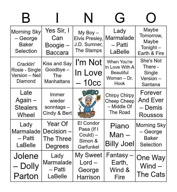 This bingo card has a free space and 125 words: Morning Sky – George Baker Selection, Late Again – Stealers Wheel, Immer wieder sonntags – Cindy & Bert, Year Of Decision – The Three Degrees, Lady Bump – Penny McLean, I'm Not In Love – 10cc, Lady Marmalade – Patti LaBelle, Maybe Tomorrow, Maybe Tonight – Earth & Fire, Fantasy – Earth, Wind & Fire, Une belle histoire – Michel Fugain & Le Big Bazar, Morning Sky – George Baker Selection, Late Again – Stealers Wheel, Immer wieder sonntags – Cindy & Bert, Year Of Decision – The Three Degrees, Lady Bump – Penny McLean, I'm Not In Love – 10cc, Lady Marmalade – Patti LaBelle, Maybe Tomorrow, Maybe Tonight – Earth & Fire, Fantasy – Earth, Wind & Fire, Une belle histoire – Michel Fugain & Le Big Bazar, Morning Sky – George Baker Selection, Late Again – Stealers Wheel, Immer wieder sonntags – Cindy & Bert, Year Of Decision – The Three Degrees, Lady Bump – Penny McLean, I'm Not In Love – 10cc, Lady Marmalade – Patti LaBelle, Maybe Tomorrow, Maybe Tonight – Earth & Fire, Fantasy – Earth, Wind & Fire, Une belle histoire – Michel Fugain & Le Big Bazar, Morning Sky – George Baker Selection, Late Again – Stealers Wheel, Immer wieder sonntags – Cindy & Bert, Year Of Decision – The Three Degrees, Lady Bump – Penny McLean, I'm Not In Love – 10cc, Lady Marmalade – Patti LaBelle, Maybe Tomorrow, Maybe Tonight – Earth & Fire, Fantasy – Earth, Wind & Fire, Une belle histoire – Michel Fugain & Le Big Bazar, Morning Sky – George Baker Selection, Late Again – Stealers Wheel, Immer wieder sonntags – Cindy & Bert, Year Of Decision – The Three Degrees, Lady Bump – Penny McLean, I'm Not In Love – 10cc, Lady Marmalade – Patti LaBelle, Maybe Tomorrow, Maybe Tonight – Earth & Fire, Fantasy – Earth, Wind & Fire, Une belle histoire – Michel Fugain & Le Big Bazar, The Air That I Breathe - 2008 Remastered Version – The Hollies, Airport – The Motors, Black Betty – Ram Jam, Born to Be Alive - Original Mix 79 – Patrick Hernandez, Borriquito – Peret, Brown Eyed Girl – Van Morrison, Bus Stop – The Hollies, Bye Bye Baby – Bay City Rollers, California Dreamin' - Single Version – The Mamas & The Papas, Chirpy Chirpy Cheep Cheep – Middle Of The Road, Cracklin' Rosie - Single Version – Neil Diamond, Dirty Ol' Man – The Three Degrees, Do Wah Diddy Diddy – Manfred Mann, Don't Go Breaking My Heart – Elton John, Kiki Dee, Don't Stop Me Now - 2011 Remaster – Queen, Dreadlock Holiday – 10cc, Du – Peter Maffay, El Condor Pasa (If I Could) – Simon & Garfunkel, Follow Me - Single Version – Amanda Lear, Forever And Ever – Demis Roussos, Green Green Grass Of Home – Tom Jones, Have You Ever Seen The Rain – Creedence Clearwater Revival, Honey, Honey – ABBA, The House Of The Rising Sun – The Animals, I Am...I Said - Single Version – Neil Diamond, I Love to Love – Tina Charles, I'm a Train – Albert Hammond, I'm in the Mood for Dancing – The Nolans, Ich bin wie du – Marianne Rosenberg, If You Can't Give Me Love – Suzi Quatro, In the Ghetto – Elvis Presley, In the Summertime – Mungo Jerry, Islands In the Stream – Dolly Parton, Kenny Rogers, Jolene – Dolly Parton, Kiss and Say Goodbye – The Manhattans, Kung Fu Fighting – Carl Douglas, Lady Marmalade - Single Version – LaBelle, The Last Farewell – Roger Whittaker, Let Your Love Flow – The Bellamy Brothers, Livin' Thing – Electric Light Orchestra, Living Next Door to Alice – Smokie, Love Is In The Air – John Paul Young, Mon Amour – BZN, Morning Has Broken – Yusuf / Cat Stevens, My Boy – Elvis Presley, J.D. Sumner, The Stamps, My Sweet Lord – George Harrison, Non non rien n'a changé – Les Poppys, Nutbush City Limits - Remastered – Ike & Tina Turner, One Way Ticket – Eruption, One Way Wind – The Cats, Paloma Blanca – George Baker Selection, Piano Man – Billy Joel, Please Mr. Postman – Carpenters, Pour un flirt – Michel Delpech, Rose Garden - Single Version – Lynn Anderson, Ruthless Queen – Kayak, San Francisco (Be Sure to Wear Flowers in Your Hair) - Single Version – Scott McKenzie, She's Not There - Single Version – Santana, Soley Soley – Middle Of The Road, Some Girls – Racey, Stayin' Alive - Remastered Version – Bee Gees, Stumblin' In - 2017 Remaster – Suzi Quatro, Sugar Baby Love – The Rubettes, Suspicious Minds – Elvis Presley, Swinging on a star – Spooky & Sue, Tell Me Your Plans – The Shirts, Three Little Birds – Bob Marley & The Wailers, Too Much, Too Little, Too Late – Johnny Mathis, Deniece Williams, Venus – Shocking Blue, When You're In Love With A Beautiful Woman – Dr. Hook, Windsurfin' (1978) - Original Version 1978 – The Surfers, Wuthering Heights – Kate Bush, Year Of The Cat - 2001 Remastered Version – Al Stewart, Yes Sir, I Can Boogie – Baccara and (You Gotta Walk) Don't Look Back - 2002 Remastered Version – Peter Tosh.