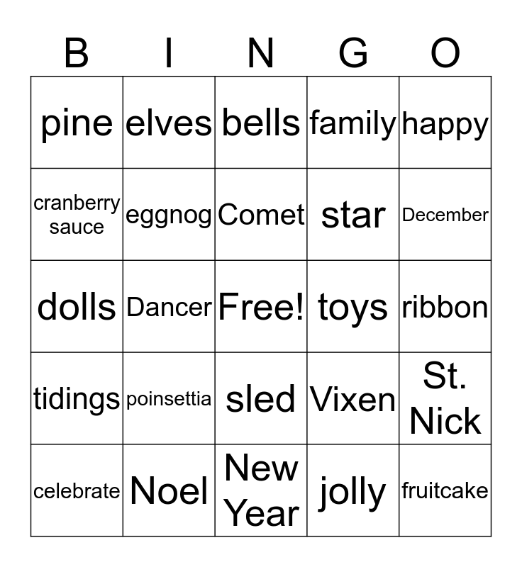This bingo card has a free space and 74 words: Advent, angels, bells, Bethlehem, Blitzen, candles, candy canes, cards, celebrate, chimney, Christmas cookies, Christmas tree, Comet, cranberry sauce, Cupid, Dancer, Dasher, December, decorations, dolls, eggnog, elves, family, Frosty, fruitcake, gift boxes, gifts, goodwill, greetings, ham, happy, holiday, holly, holy, icicles, jolly, lights, merry, miracle, mistletoe, New Year, Noel, North Pole, party, pie, pine, plum pudding, poinsettia, Prancer, presents, pumpkin pie, reindeer, ribbon, Rudolph, Scrooge, Santa, sled, sleigh bells, snowflakes, St. Nick, star, stocking stuffers, tidings, tinsel, toys, tradition, turkey, vacation, Vixen, Winter, wrapping paper, wreath, yule and yuletide.