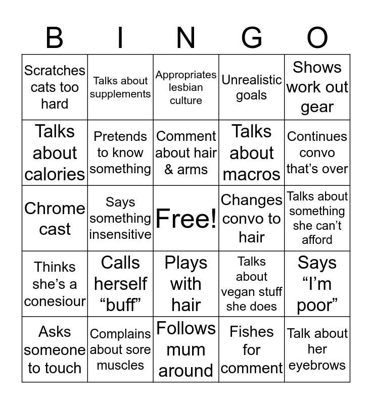 This bingo card has a free space and 24 words: Calls herself “buff”, Complains about sore muscles, Comment about hair & arms, Asks someone to touch, Shows work out gear, Scratches cats too hard, Talks about calories, Talks about supplements, Changes convo to hair, Plays with hair, Talks about macros, Chrome cast, Talks about vegan stuff she does, Says “I’m poor”, Pretends to know something, Fishes for comment, Talks about something she can’t afford, Appropriates lesbian culture, Continues convo that’s over, Says something insensitive, Talk about her eyebrows, Thinks she’s a conesiour, Unrealistic goals and Follows mum around.