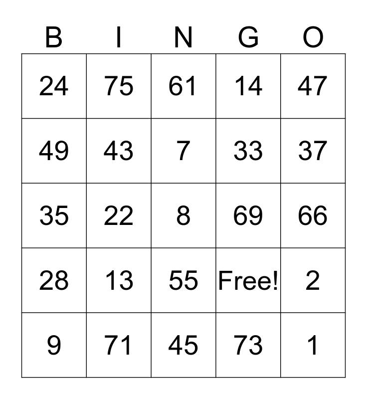 This bingo card has 25 words: 13, 45, 7, 9, 47, 24, 49, 75, 69, 55, 33, 35, Free!, 2, 43, 1, 66, 61, 37, 22, 8, 71, 28, 14 and 73.