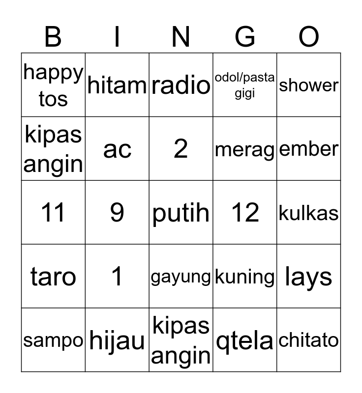 This bingo card has a free space and 24 words: 1, hijau, 2, sampo, shower, happy tos, kipas angin, hitam, 12, gayung, merag, 11, kuning, lays, ac, qtela, kulkas, radio, ember, 9, chitato, taro, odol/pasta gigi and kipas angin.
