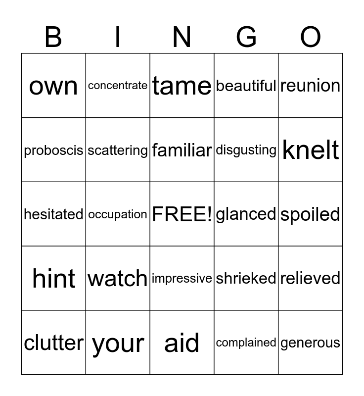 This bingo card has a free space and 24 words: watch, your, familiar, clutter, reunion, own, proboscis, concentrate, glanced, impressive, disgusting, hesitated, shrieked, relieved, scattering, complained, spoiled, tame, knelt, occupation, generous, hint, beautiful and aid.