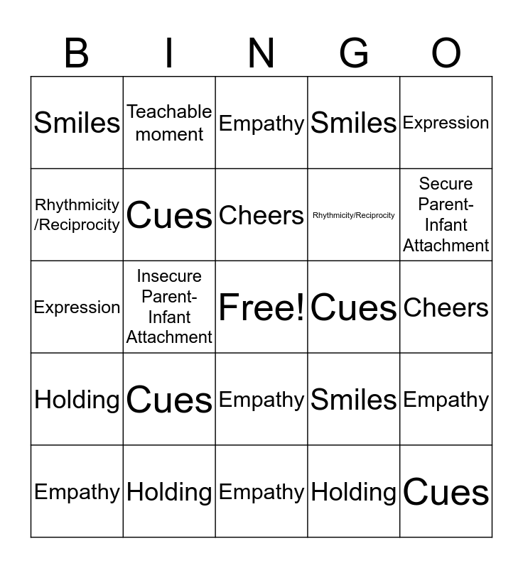 This bingo card has a free space and 24 words: Cues, Holding, Cheers, Empathy, Expression, Smiles, Rhythmicity /Reciprocity, Teachable moment, Cues, Empathy, Rhythmicity/Reciprocity, Expression, Smiles, Empathy, Cues, Holding, Cheers, Empathy, Secure Parent-Infant Attachment, Insecure Parent-Infant Attachment, Cues, Holding, Smiles and Empathy.