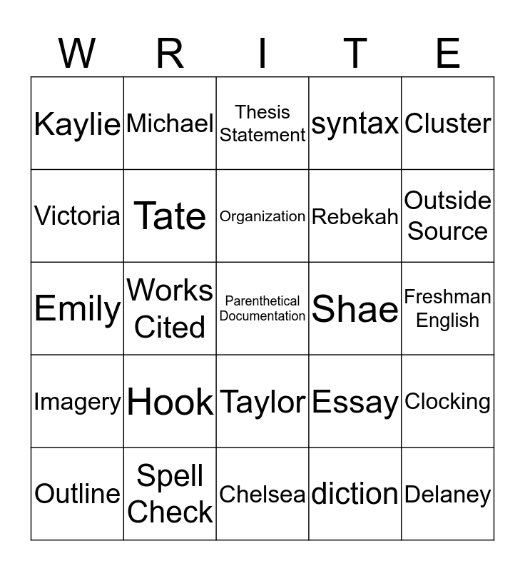 This bingo card has 25 words: Hook, Chelsea, Organization, Outline, Cluster, Kaylie, Victoria, Michael, Shae, Taylor, Rebekah, Emily, Essay, Clocking, Tate, Delaney, Freshman English, Thesis Statement, Outside Source, Works Cited, Parenthetical Documentation, Spell Check, Imagery, syntax and diction.