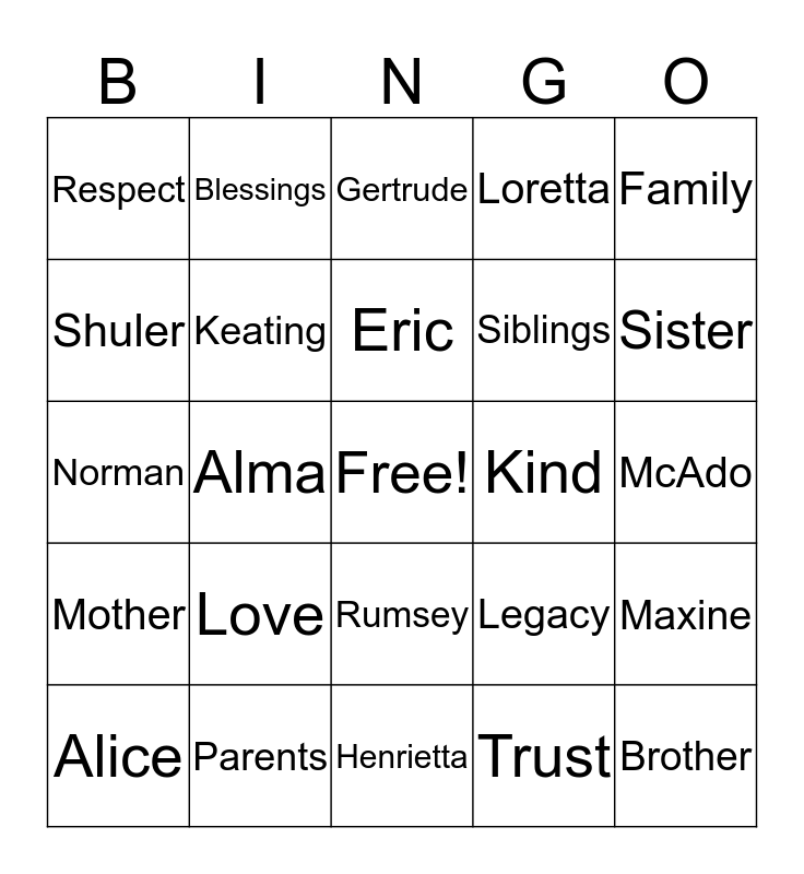 This bingo card has a free space and 24 words: Love, Parents, Eric, Alice, Family, Respect, Shuler, Blessings, Kind, Rumsey, Siblings, Norman, Legacy, Maxine, Keating, Trust, McAdo, Gertrude, Sister, Alma, Brother, Mother, Loretta and Henrietta.