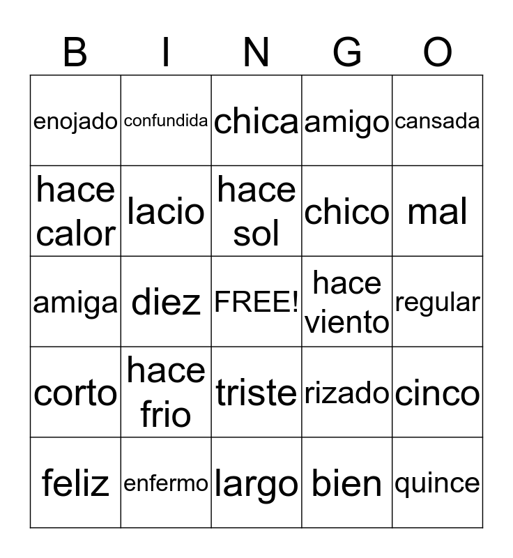 This bingo card has a free space and 24 words: hace frio, enfermo, hace sol, feliz, cansada, enojado, hace calor, confundida, hace viento, triste, chico, amiga, rizado, cinco, lacio, bien, regular, chica, mal, diez, quince, corto, amigo and largo.