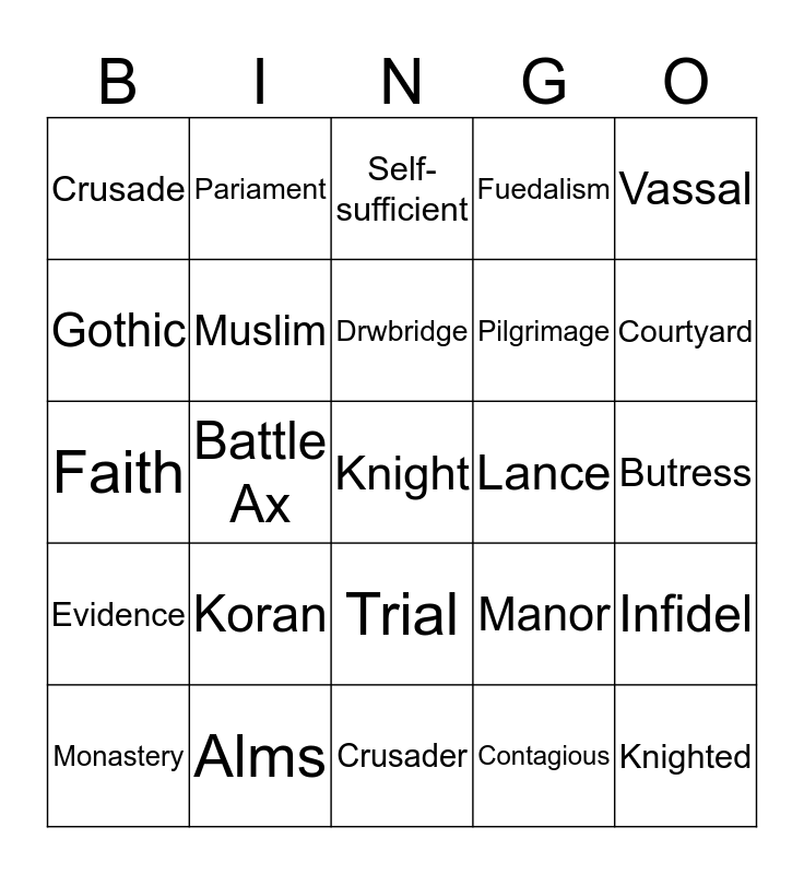 This bingo card has a free space and 57 words: Convent, Monastery, Nun, Crusade, Crusader, Holy Land, Muslim, Pilgrim, Pilgrimage, Spice, Fuedalism, Fief, Lord, Page, Peasant, Squire, Vassal, Battle Ax, Dagger, Knighted, Lance, Blacksmith, Manor, Self-sufficient, Serf, Drwbridge, Household, Moat, Courtyard, Joust, Tournament, Bishop, Cathedral, University, Butress, Gothic, Romanesque, Faith, Advice, Evidence, Pariament, Trial, Fast, Hegira, Vision, Idol, Koran, Alms, Announcement, Hajj, Jihad, Contagious, Surplus, Chemistry, Mosque, Infidel and Surplus.