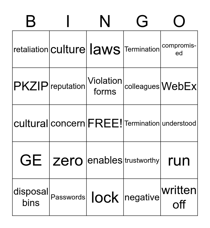 This bingo card has a free space and 24 words: zero, Passwords, Violation forms, disposal bins, compromis-ed, retaliation, PKZIP, culture, Termination, enables, colleagues, cultural, trustworthy, run, reputation, negative, understood, laws, WebEx, concern, written off, GE, Termination and lock.