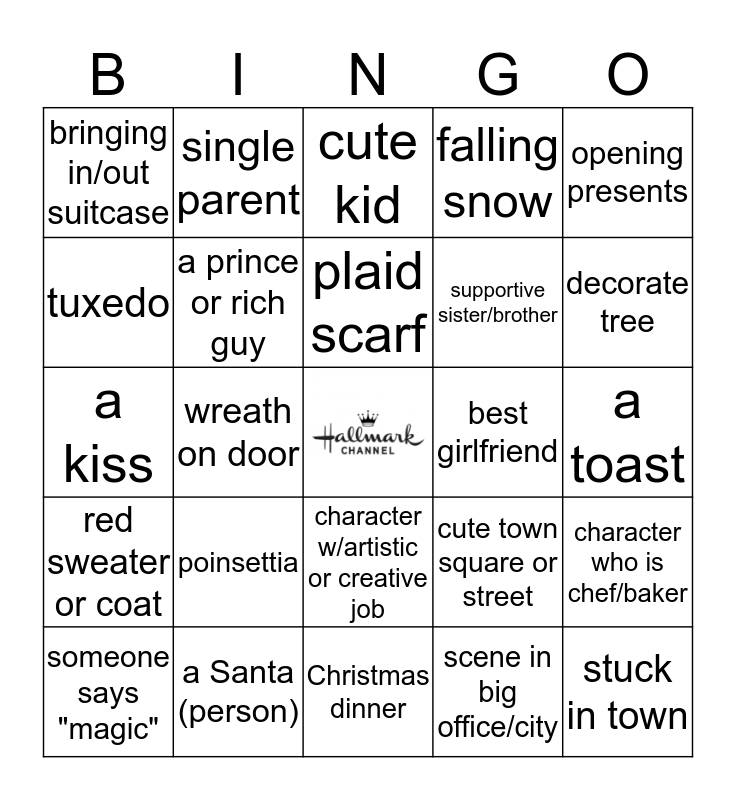 This bingo card has a free space and 69 words: outside lights, inn or cabin, Christmas Cookies, carolers or choir, a toast, difficult boss, a prince or rich guy, fire in the fireplace, supportive sister/brother, throwing snowballs, red sweater or coat, stockings on fireplace, falling snow, opening presents, sleigh/carriage ride, poinsettia, plaid scarf, best girlfriend, former boyfriend, a kiss, a Santa (person), Christmas dinner, cute town square or street, cute shop/cafe, stressful job, snowman, snow storm, beloved pet, stuck in town, interrupted kiss, single parent, female rival, big holiday event, hot cider, chocolate, or eggnog, small town, mistletoe, baking or cooking, knit hat, decorate tree, someone says "magic", obvious fake snow, cute kid, scene in big office/city, taking photo/selfie, ice skating or sledding, character who is a writer, character w/artistic or creative job, token minority character, talking on cell phone, bringing in/out suitcase, wreath on door, singing carols, wrapping Christmas presents, character who is chef/baker, a wedding, tree lighting ceremony, long evening gown, little black cocktail dress, gift of jewelry, tuxedo, Santa hat, putting on gloves or mittens, someone who cries, cutting down Christmas tree, candy cane, a breakup, unexpected visitor, travels abroad for work and working on laptop.