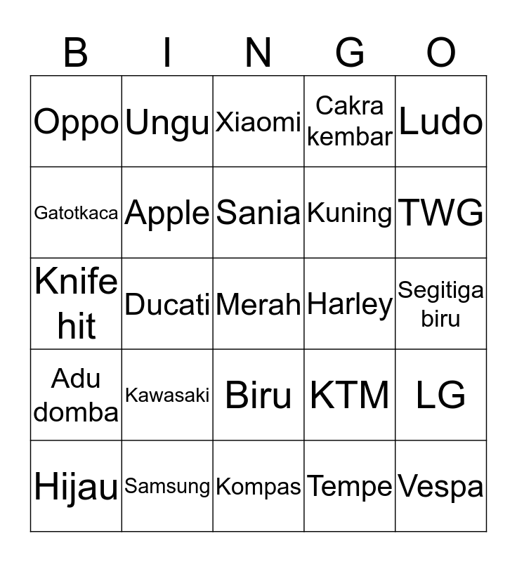 This bingo card has 25 words: Kawasaki, Kompas, Sania, Hijau, Ludo, Oppo, Gatotkaca, Ungu, Harley, Biru, Kuning, Knife hit, KTM, LG, Apple, Vespa, Segitiga biru, Xiaomi, TWG, Ducati, Merah, Samsung, Adu domba, Cakra kembar and Tempe.