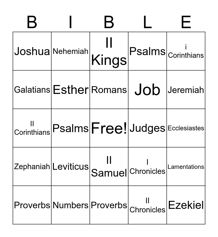This bingo card has a free space and 24 words: Leviticus, Numbers, Romans, Proverbs, i Corinthians, Joshua, Galatians, Nehemiah, Judges, II Samuel, Job, II Corinthians, I Chronicles, Lamentations, Esther, II Chronicles, Ecclesiastes, II Kings, Jeremiah, Psalms, Ezekiel, Zephaniah, Psalms and Proverbs.