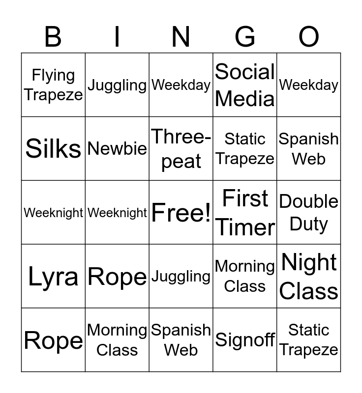 This bingo card has a free space and 47 words: Flying Trapeze, Static Trapeze, Dance Trapeze, Spanish Web, Rope, Trampoline, Juggling, Lyra, Silks, Hammock, Newbie, Social Media, Night Class, Morning Class, Double Duty, Two-fer, Three-peat, First Timer, Weekender, Weekday, Weeknight, Signoff, Flying Trapeze, Static Trapeze, Dance Trapeze, Spanish Web, Rope, Trampoline, Juggling, Lyra, Silks, Hammock, Newbie, Social Media, Night Class, Morning Class, Double Duty, Two-fer, Three-peat, First Timer, Weekender, Weekday, Weeknight, Signoff, Pull-ups, Push-ups and Planner.