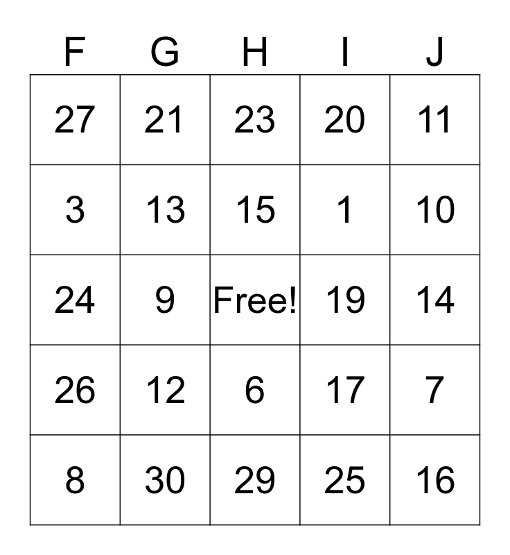 This bingo card has a free space and 24 words: 12, 30, 15, 8, 11, 27, 3, 21, 19, 6, 1, 24, 17, 7, 13, 25, 14, 23, 10, 9, 16, 26, 20 and 29.