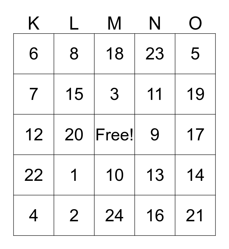 This bingo card has a free space and 24 words: 1, 2, 3, 4, 5, 6, 7, 8, 9, 10, 11, 12, 13, 14, 15, 16, 17, 18, 19, 20, 21, 22, 23 and 24.