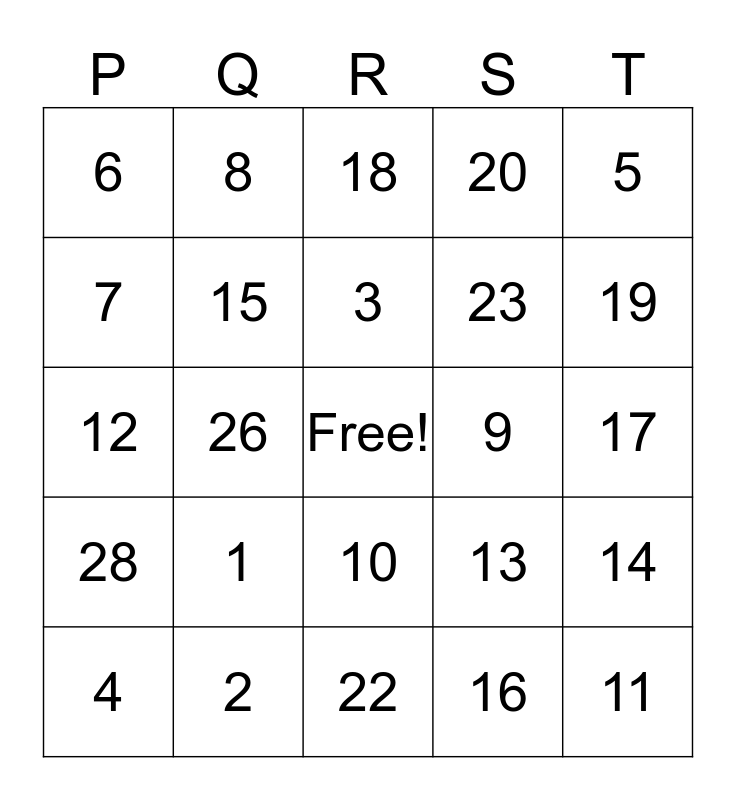 This bingo card has a free space and 24 words: 1, 2, 3, 4, 5, 6, 7, 8, 9, 10, 23, 12, 13, 14, 15, 16, 17, 18, 19, 26, 11, 28, 20 and 22.