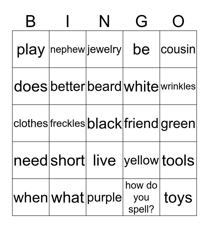 This bingo card has 54 words: want, need, like, buy, live, work, be, do, does, have, play, who, what, when, where, purple, black, white, red, green, yellow, neighbor, friend, cousin, niece, nephew, aunt, uncle, how do you say?, how do you spell?, fall, winter, summer, spring, jewelry, furniture, clothes, tools, toys, better, best, cute, ugly, tall, short, fat, thin, mustache, beard, freckles, wrinkles, blond, brunet and dimples.