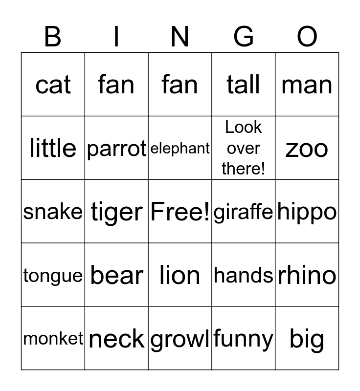 This bingo card has a free space and 24 words: bear, neck, elephant, monket, man, cat, little, fan, giraffe, lion, Look over there!, snake, hands, rhino, parrot, funny, hippo, fan, zoo, tiger, big, tongue, tall and growl.