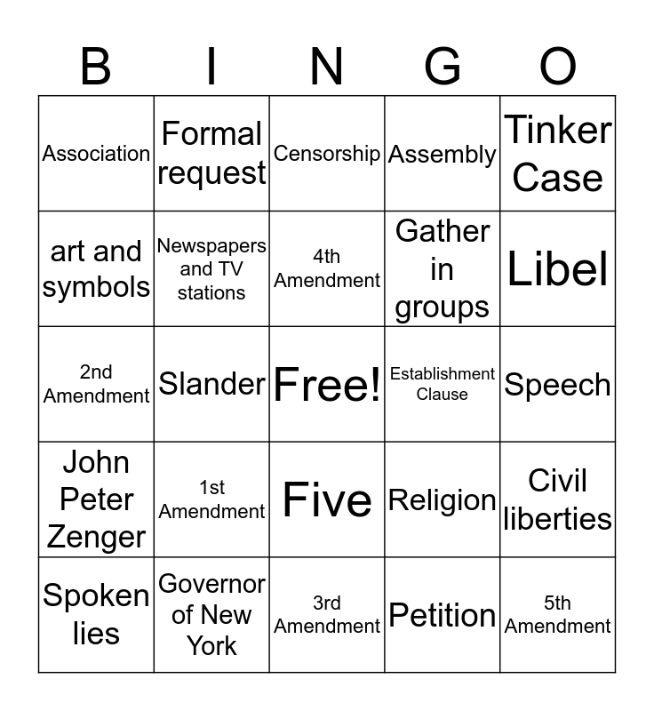 This bingo card has a free space and 28 words: Civil liberties, Press, Gather in groups, Petition, art and symbols, Censorship, Formal request, John Peter Zenger, Establishment Clause, Spoken lies, 2nd Amendment, Assembly, Governor of New York, 3rd Amendment, Libel, Written lies, 1st Amendment, Newspapers and TV stations, 4th Amendment, Five, Association, Clubs and political parties, 5th Amendment, Slander, Speech, Religion, Tinker Case and Nonverbal communication.