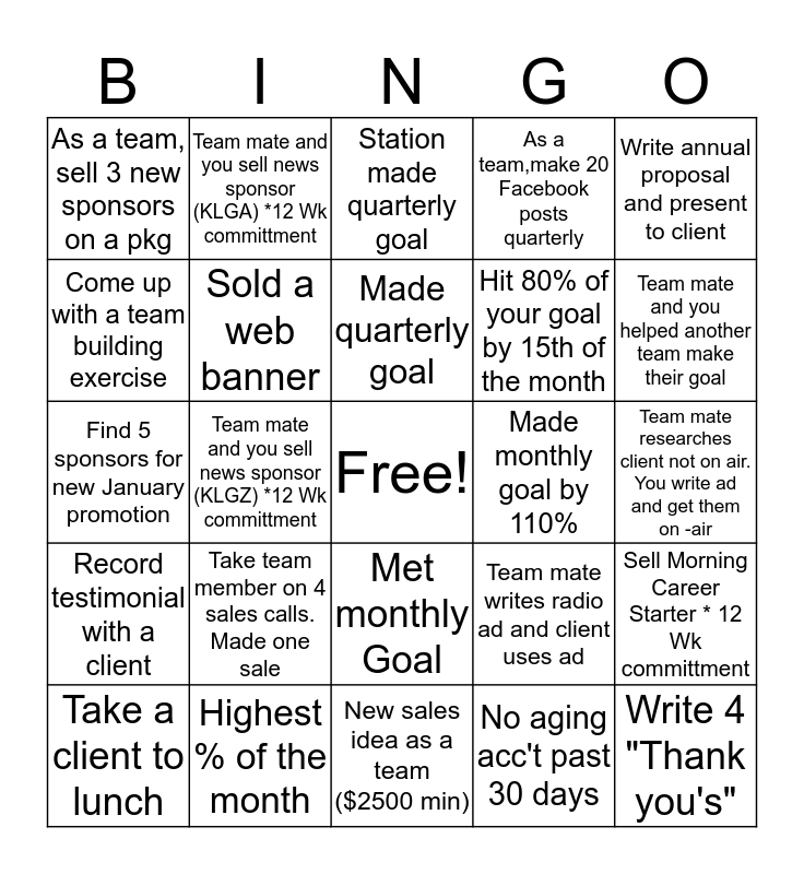 This bingo card has a free space and 24 words: Take team member on 4 sales calls. Made one sale, Highest % of the month, Made quarterly goal, Take a client to lunch, Write annual proposal and present to client, As a team, sell 3 new sponsors on a pkg, Come up with a team building exercise, Team mate and you sell news sponsor (KLGA) *12 Wk committment, Made monthly goal by 110%, Met monthly Goal, Hit 80% of your goal by 15th of the month, Find 5 sponsors for new January promotion, Team mate writes radio ad and client uses ad, Sell Morning Career Starter * 12 Wk committment, Sold a web banner, No aging acc't past 30 days, Team mate researches client not on air. You write ad and get them on -air, Station made quarterly goal, Team mate and you helped another team make their goal, Team mate and you sell news sponsor (KLGZ) *12 Wk committment, Write 4 "Thank you's", Record testimonial with a client, As a team,make 20 Facebook posts quarterly and New sales idea as a team ($2500 min).