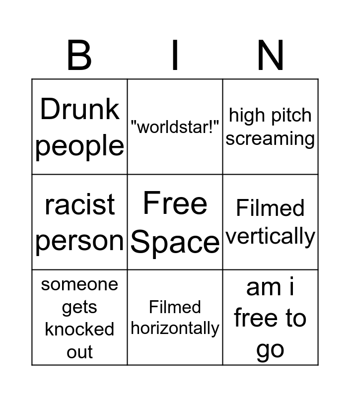 This bingo card has a free space and 8 words: Filmed vertically, high pitch screaming, "worldstar!", someone gets knocked out, Drunk people, am i free to go, racist person and Filmed horizontally.