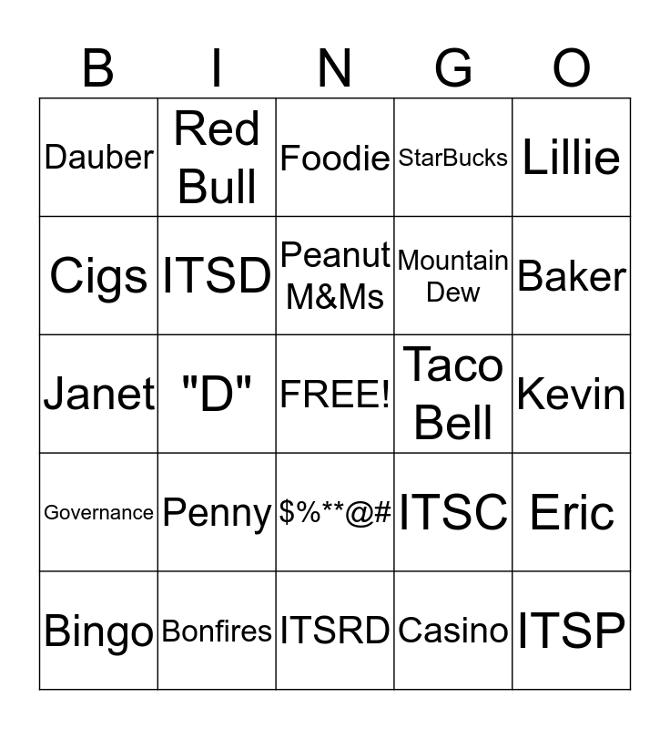 This bingo card has a free space and 24 words: Penny, Bonfires, Peanut M&Ms, Bingo, Lillie, Dauber, Cigs, Red Bull, Taco Bell, $%**@#, Mountain Dew, Janet, ITSC, Eric, ITSD, Casino, Kevin, Foodie, Baker, "D", ITSP, Governance, StarBucks and ITSRD.