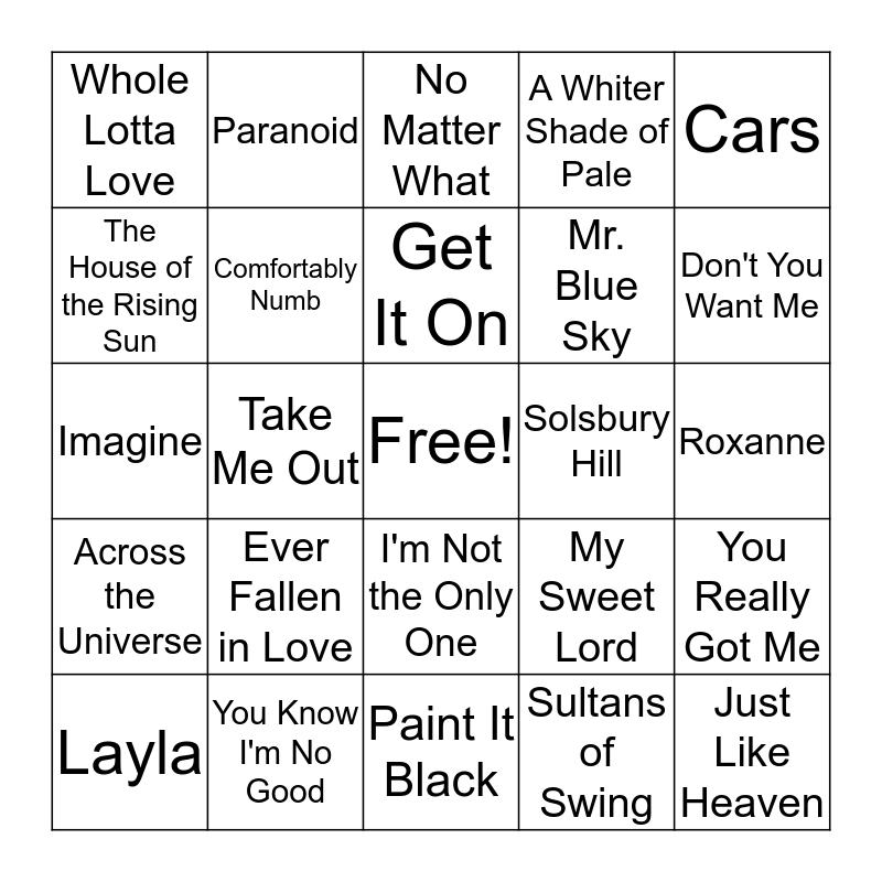 This bingo card has a free space and 50 words: Heroes, Just Like Heaven, Something, Paint It Black, Ever Fallen in Love, We Can Work It Out, Paranoid, The Killing Moon, The House of the Rising Sun, Time of the Season, Comfortably Numb, A Whiter Shade of Pale, You Really Got Me, My Sweet Lord, Satisfaction, Paper Planes, Get It On, Solsbury Hill, Everybody Wants to Rule the World, Cars, Take Me Out, Sultans of Swing, Whole Lotta Love, Mr. Blue Sky, Tiny Dancer, Come on Eileen, Don't You Want Me, I Ran, No Matter What, I'm Not the Only One, Fame, Creep, Feel Good Inc, Wonderwall, You Know I'm No Good, Rehab, Budapest, Bitter Sweet Symphony, Should I Stay or Should I Go, Roxanne, Don't Stop Me Now, Sunshine of Your Love, All Right Now, The Logical Song, Layla, Imagine, Hungry Like the Wolf, Under Pressure, Across the Universe and Bennie and the Jets.