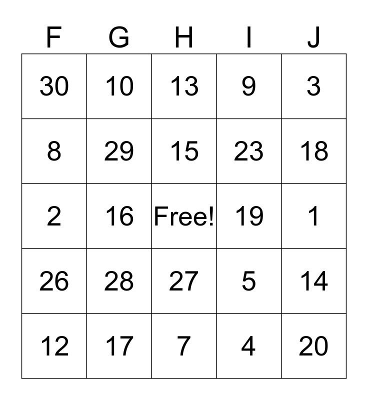 This bingo card has a free space and 27 words: 5, 11, 23, 7, 8, 13, 10, 26, 19, 14, 2, 9, 12, 17, 18, 25, 29, 15, 28, 30, 1, 4, 16, 20, 27, 3 and 6.