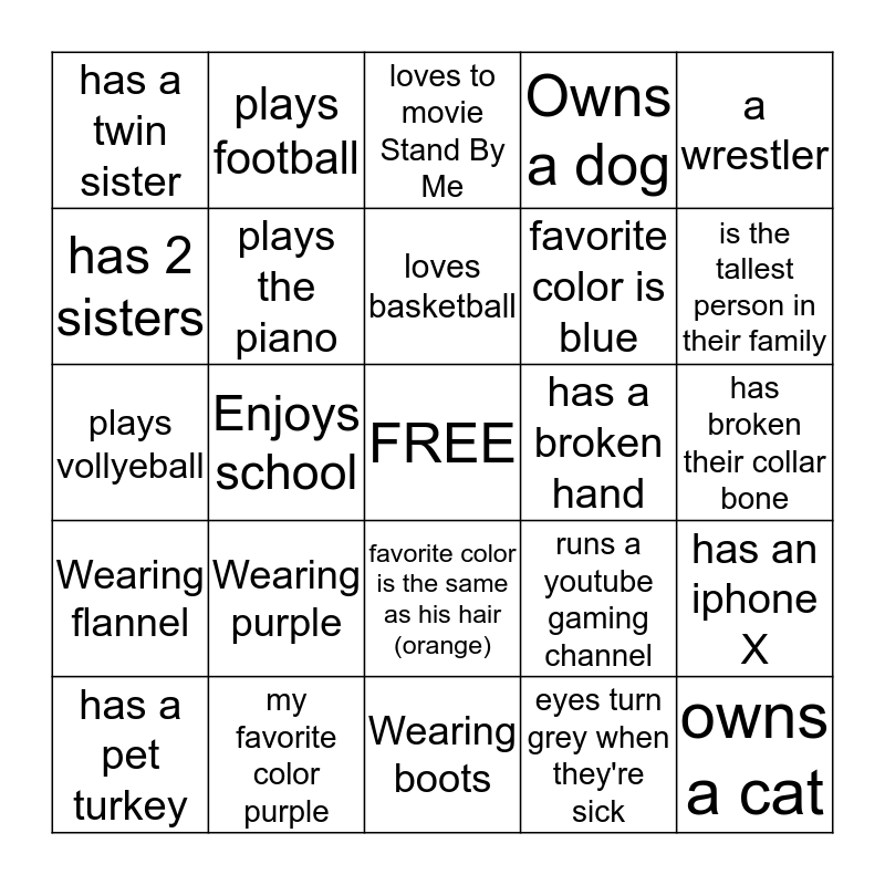 This bingo card has a free space and 24 words: Wearing purple, my favorite color purple, loves basketball, has a pet turkey, a wrestler, has a twin sister, has 2 sisters, plays football, has a broken hand, favorite color is the same as his hair (orange), favorite color is blue, plays vollyeball, runs a youtube gaming channel, has an iphone X, plays the piano, eyes turn grey when they're sick, has broken their collar bone, loves to movie Stand By Me, is the tallest person in their family, Enjoys school, owns a cat, Wearing flannel, Owns a dog and Wearing boots.