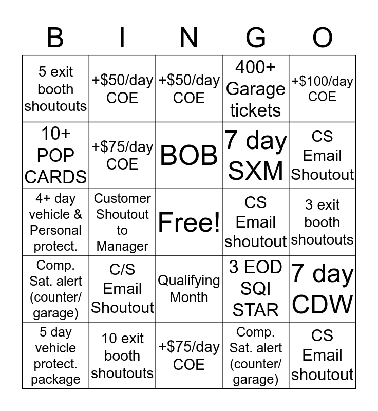 This bingo card has a free space and 24 words: C/S Email Shoutout, 10 exit booth shoutouts, BOB, 5 day vehicle protect. package, +$100/day COE, 5 exit booth shoutouts, 10+ POP CARDS, +$50/day COE, CS Email shoutout, Qualifying Month, 7 day SXM, 4+ day vehicle & Personal protect., 3 EOD SQI STAR, 7 day CDW, +$75/day COE, Comp. Sat. alert (counter/ garage), 3 exit booth shoutouts, +$50/day COE, CS Email Shoutout, Customer Shoutout to Manager, CS Email shoutout, Comp. Sat. alert (counter/ garage), 400+ Garage tickets and +$75/day COE.