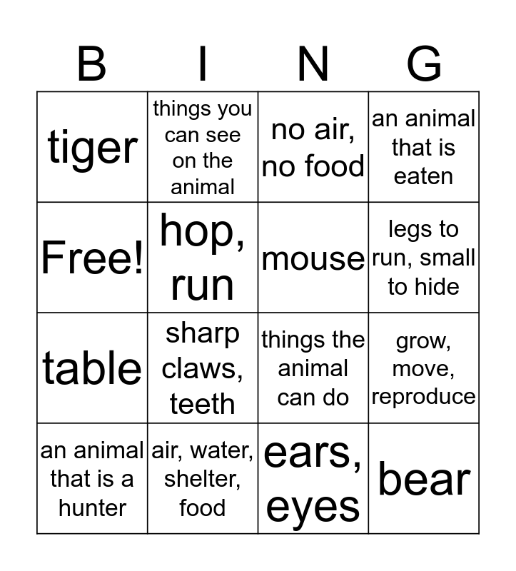 This bingo card has 16 words: air, water, shelter, food, grow, move, reproduce, no air, no food, tiger, table, things you can see on the animal, things the animal can do, ears, eyes, Free!, hop, run, an animal that is a hunter, an animal that is eaten, sharp claws, teeth, legs to run, small to hide, mouse and bear.