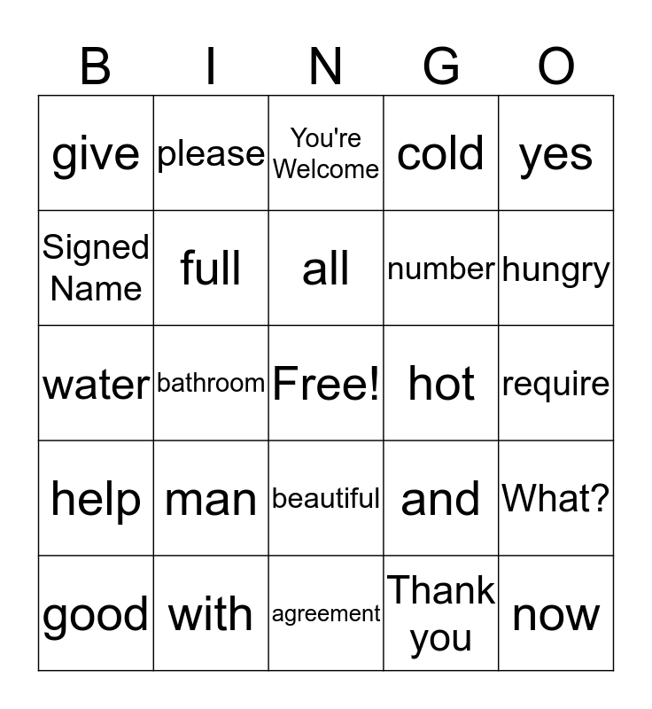 This bingo card has a free space and 44 words: focus, now, fine, good, bad, Thank you, You're Welcome, no, yes, with, cold, hot, beautiful, man, woman, agreement, same, water, ice, hungry, please, eat, candy, give, can, require, want, need, and, help, Why?, What?, When?, How?, bathroom, more, less, again, all, Signed Name, number, family, full and tomorrow.