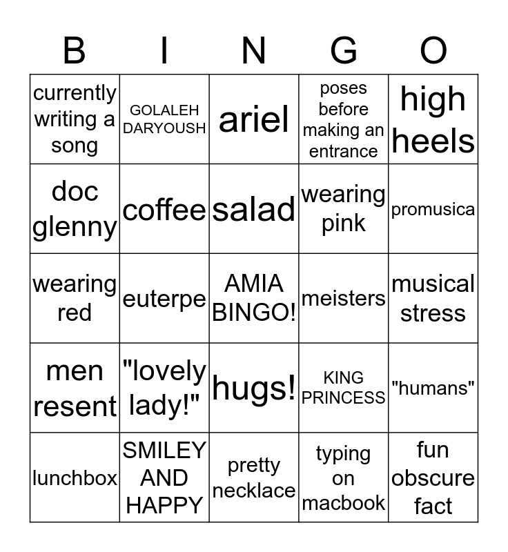 This bingo card has a free space and 24 words: "lovely lady!", SMILEY AND HAPPY, salad, lunchbox, high heels, currently writing a song, doc glenny, GOLALEH DARYOUSH, meisters, hugs!, wearing pink, wearing red, KING PRINCESS, "humans", coffee, typing on macbook, musical stress, ariel, promusica, euterpe, fun obscure fact, men resent, poses before making an entrance and pretty necklace.
