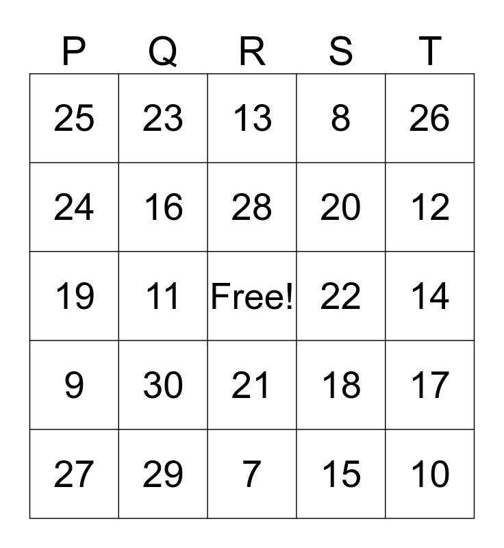 This bingo card has a free space and 24 words: 30, 29, 28, 27, 26, 25, 24, 23, 22, 21, 20, 19, 18, 17, 16, 15, 14, 13, 12, 11, 10, 9, 8 and 7.