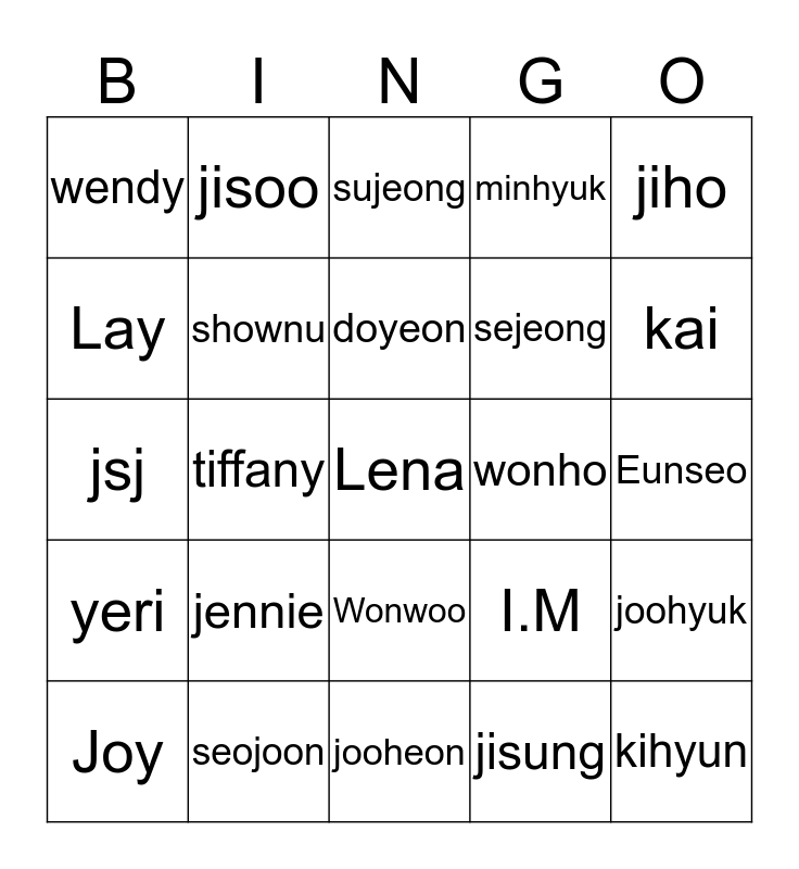 This bingo card has 25 words: jennie, jooheon, doyeon, Joy, jiho, wendy, Lay, jisoo, wonho, Wonwoo, sejeong, jsj, I.M, joohyuk, shownu, kihyun, Eunseo, sujeong, kai, tiffany, Lena, seojoon, yeri, minhyuk and jisung.