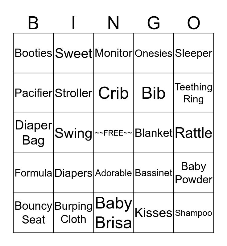 This bingo card has a free space and 38 words: Car Seat, Crying, Nursery, Stroller, Baby Powder, Diapers, Crib, Bottle, Sleeper, Bib, Swing, Onesies, Shampoo, Rattle, Pacifier, Formula, Playpen, Monitor, High Chair, Blanket, Booties, Burping Cloth, Teething Ring, Bouncy Seat, Cuddle, Baby Brisa, Mama Vero, Daddy Alan, Giggles, Little Fingers, Smiles, Adorable, Kisses, Sweet, Cheerish, Bassinet, Diaper Bag and Its a Girl.