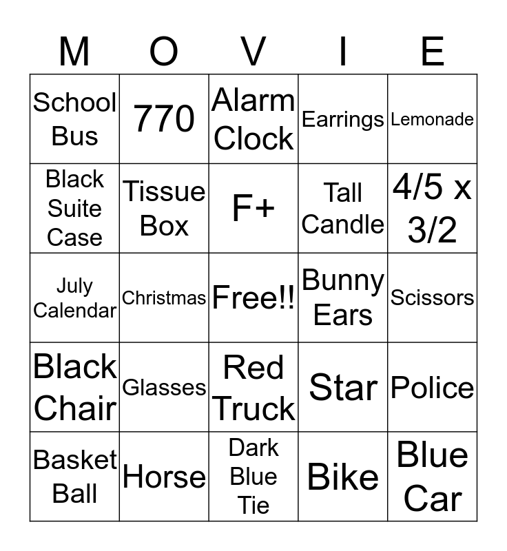 This bingo card has a free space and 29 words: Basket Ball, Camera, Christmas, Basket Ball Hoop, School Bus, Alarm Clock, Tissue Box, Glasses, Bunny Ears, Horse, Scissors, Blue Car, Dark Blue Tie, Bike, 4/5 x 3/2, Santa, Red Truck, Black Chair, Lemonade, July Calendar, Star, White Cushion, Tall Candle, Black Suite Case, Earrings, 770, Police, F+ and Comic.