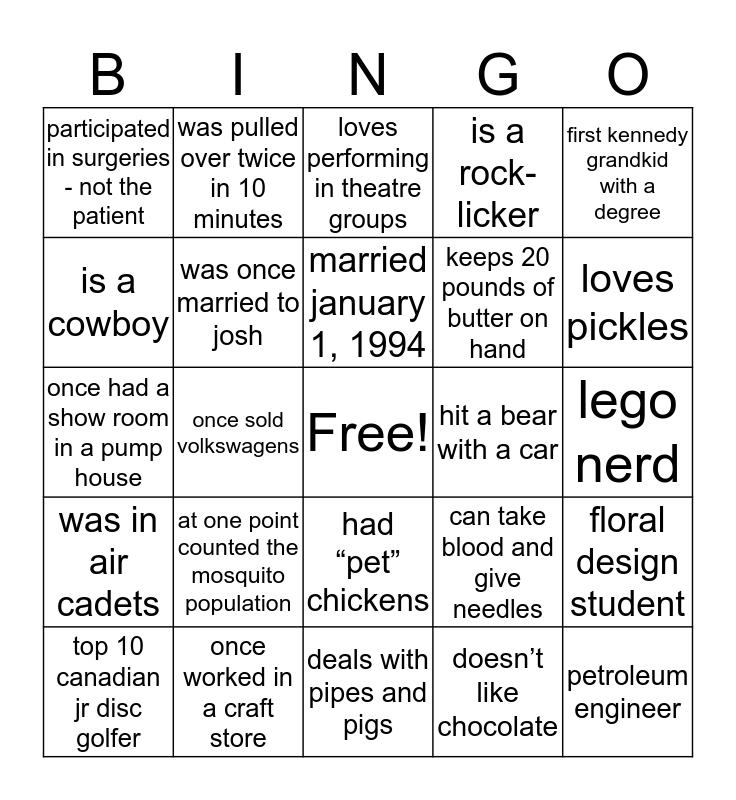 This bingo card has a free space and 25 words: at one point counted the mosquito population, deals with pipes and pigs, married january 1, 1994, top 10 canadian jr disc golfer, first kennedy grandkid with a degree, participated in surgeries - not the patient, is a cowboy, was pulled over twice in 10 minutes, hit a bear with a car, had “pet” chickens, keeps 20 pounds of butter on hand, once had a show room in a pump house, can take blood and give needles, floral design student, was once married to josh, is a realtor, lego nerd, loves performing in theatre groups, loves pickles, once sold volkswagens, petroleum engineer, once worked in a craft store, was in air cadets, is a rock-licker and doesn’t like chocolate.