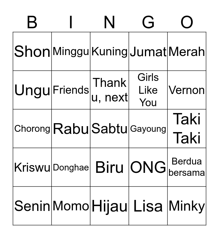 This bingo card has a free space and 24 words: Senin, Donghae, Thank u, next, Lisa, Merah, Shon, Minggu, Kuning, Gayoung, Taki Taki, Chorong, Friends, ONG, Berdua bersama, Ungu, Momo, Hijau, Jumat, Vernon, Kriswu, Rabu, Biru, Girls Like You and Minky.