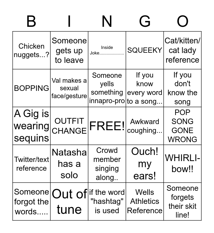 This bingo card has a free space and 24 words: Natasha has a solo, Out of tune, Someone yells something innapro-pro, Someone forgot the words....., Cat/kitten/ cat lady reference, Chicken nuggets...?, BOPPING, Someone gets up to leave, Awkward coughing..., Crowd member singing along.., If you know every word to a song..., A Gig is wearing sequins, Ouch! my ears!, WHIRLI-bow!!, Val makes a sexual face/gesture, Wells Athletics Reference, POP SONG GONE WRONG, Inside Joke...................., If you don't know the song, OUTFIT CHANGE, Someone forgets their skit line!, Twitter/text reference, SQUEEKY and if the word "hashtag" is used.