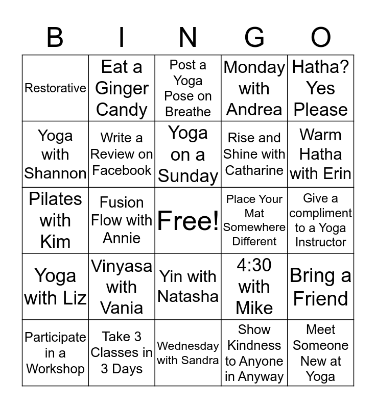 This bingo card has a free space and 24 words: Vinyasa with Vania, Take 3 Classes in 3 Days, Yoga on a Sunday, Participate in a Workshop, Hatha? Yes Please, Restorative, Yoga with Shannon, Eat a Ginger Candy, Place Your Mat Somewhere Different, Yin with Natasha, Rise and Shine with Catharine, Pilates with Kim, 4:30 with Mike, Bring a Friend, Write a Review on Facebook, Show Kindness to Anyone in Anyway, Give a compliment to a Yoga Instructor, Post a Yoga Pose on Breathe, Warm Hatha with Erin, Fusion Flow with Annie, Meet Someone New at Yoga, Yoga with Liz, Monday with Andrea and Wednesday with Sandra.
