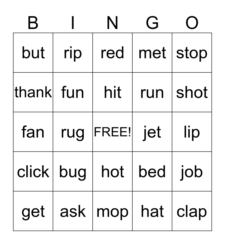 This bingo card has a free space and 24 words: bug, ask, hit, get, stop, but, thank, rip, jet, hot, run, fan, bed, job, fun, hat, lip, red, shot, rug, clap, click, met and mop.