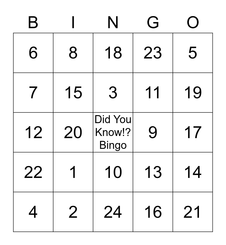 This bingo card has a free space and 24 words: 1, 2, 3, 4, 5, 6, 7, 8, 9, 10, 11, 12, 13, 14, 15, 16, 17, 18, 19, 20, 21, 22, 23 and 24.