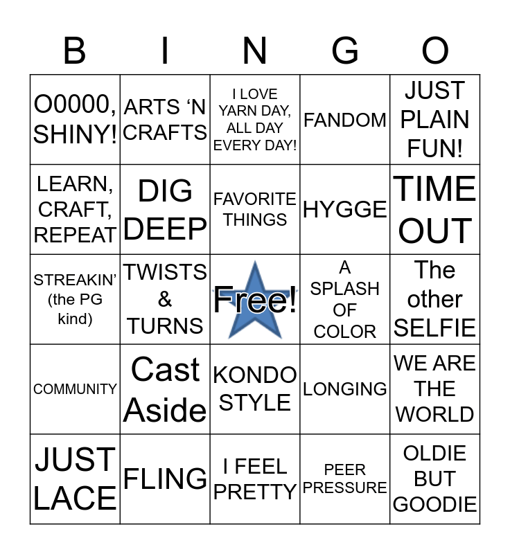 This bingo card has a free space and 24 words: Cast Aside, FLING, FAVORITE THINGS, JUST LACE, JUST PLAIN FUN!, O0000, SHINY!, LEARN, CRAFT, REPEAT, ARTS ‘N CRAFTS, A SPLASH OF COLOR, KONDO STYLE, HYGGE, STREAKIN’ (the PG kind), LONGING, WE ARE THE WORLD, DIG DEEP, PEER PRESSURE, The other SELFIE, I LOVE YARN DAY, ALL DAY EVERY DAY!, TIME OUT, TWISTS & TURNS, OLDIE BUT GOODIE, COMMUNITY, FANDOM and I FEEL PRETTY.