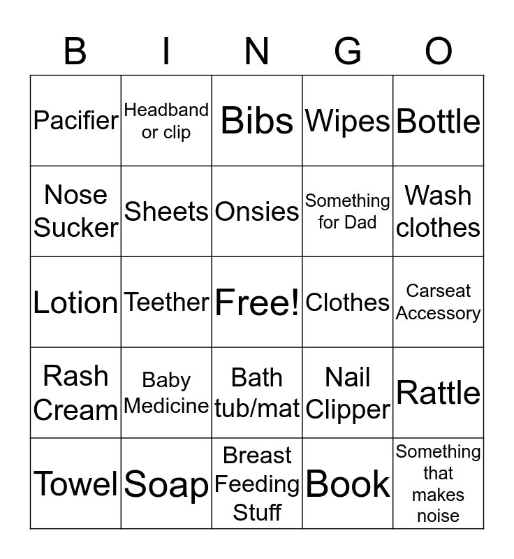 This bingo card has a free space and 34 words: Toy, Book, Stroller, Blanket, Rash Cream, Sheets, Bottle, Towel, Headband or clip, Burp rag, Onsies, Bibs, Diapers, Booties or socks, Clothes, Wash clothes, Soap, Lotion, Baby Medicine, Nail Clipper, Bath tub/mat, Sleep Sack, Pacifier, Carseat Accessory, Breast Feeding Stuff, Something that makes noise, Wipes, Something Pink, Something for Dad, Nose Sucker, Comb/ Brush, Teether, Rattle and Something for Mom.